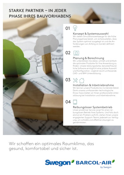 Barcol-Air und Swegon stehen für langjährige Erfahrung und Innovationskraft in der Entwicklung und Produktion von hochwertigen Klimalösungen. Mit einem klaren Fokus auf langfristige Ziele, Verantwortungsbewusstsein und kontinuierliche Verbesserung bieten wir massgeschneiderte Systeme, die auf Stabilität und Energieeffizienz ausgerichtet sind.