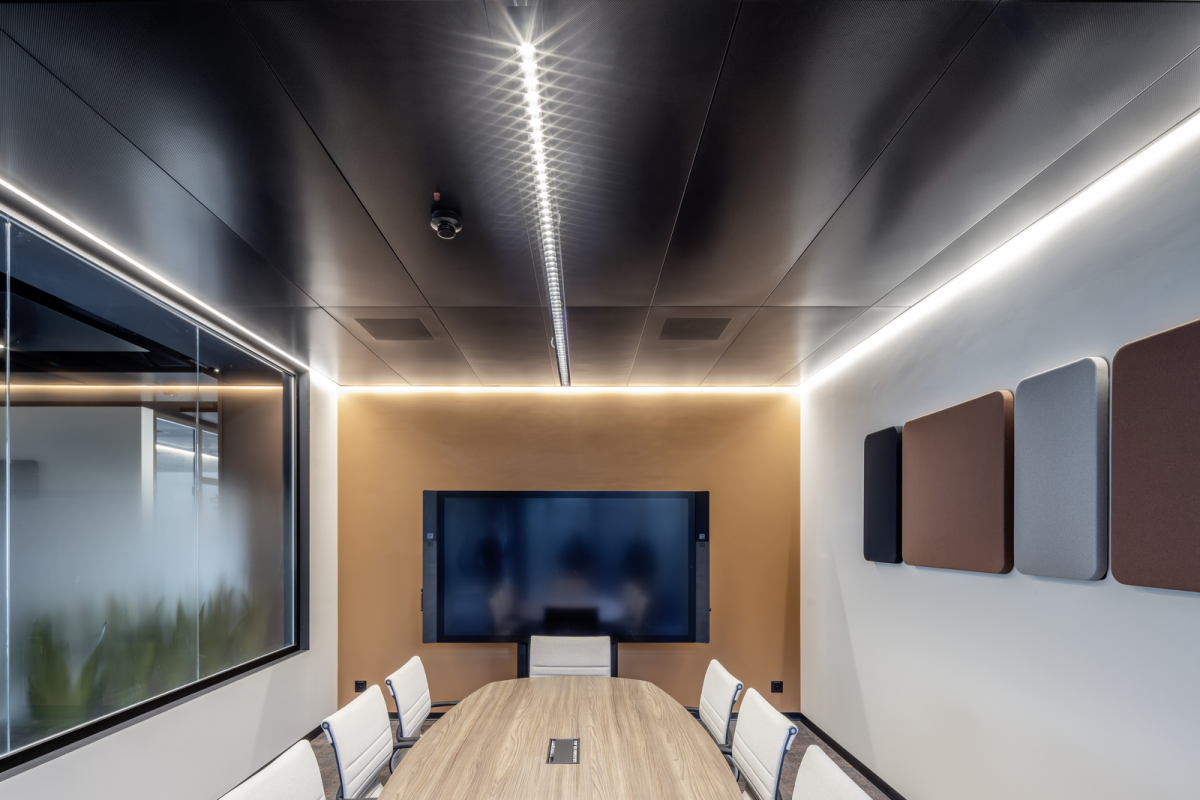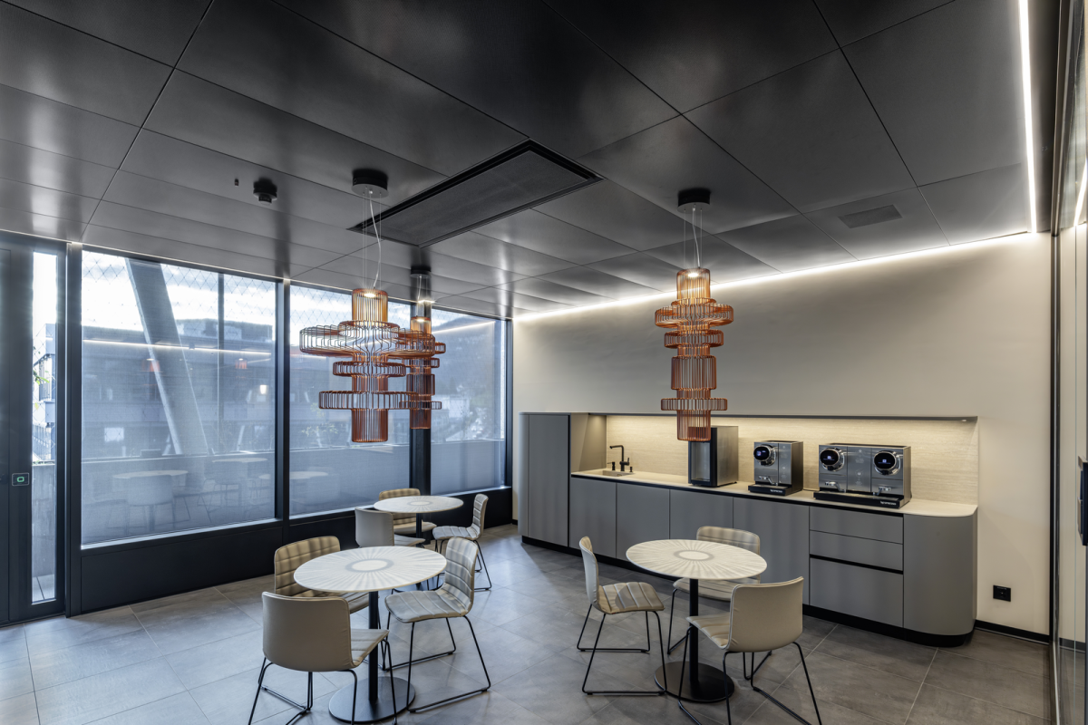 Ein zentraler Fokus lag auf einem nachhaltigen Energiekonzept. Die eingesetzten Klimadeckensysteme arbeiten nach dem Prinzip der Strahlungswärme und ermöglichen bei Heizen und Kühlen moderate Systemtemperaturen. Dadurch sinkt der Energiebedarf und es entstehen ideale Voraussetzungen für effiziente Energieerzeuger. Je nach Nutzung und Leistungsanforderung kommen unterschiedliche Systeme zum Einsatz. In den Einzelbüros und Sitzungszimmern wird das geschlossene Klimadeckensystem A11-C eingesetzt, vereinzelt ergänzt durch PARASOL Kühlbalken von Swegon, um auch bei höheren Lasten eine stabile und effiziente Temperierung sicherzustellen.