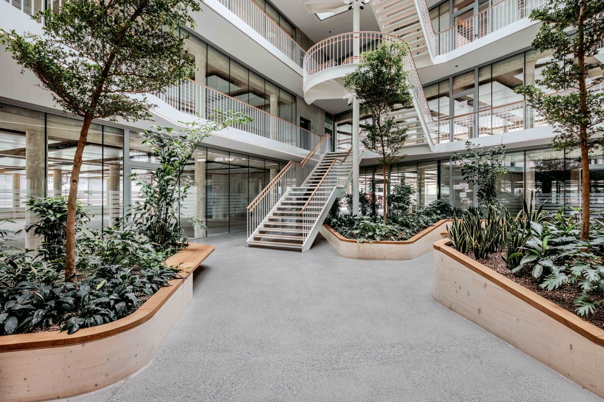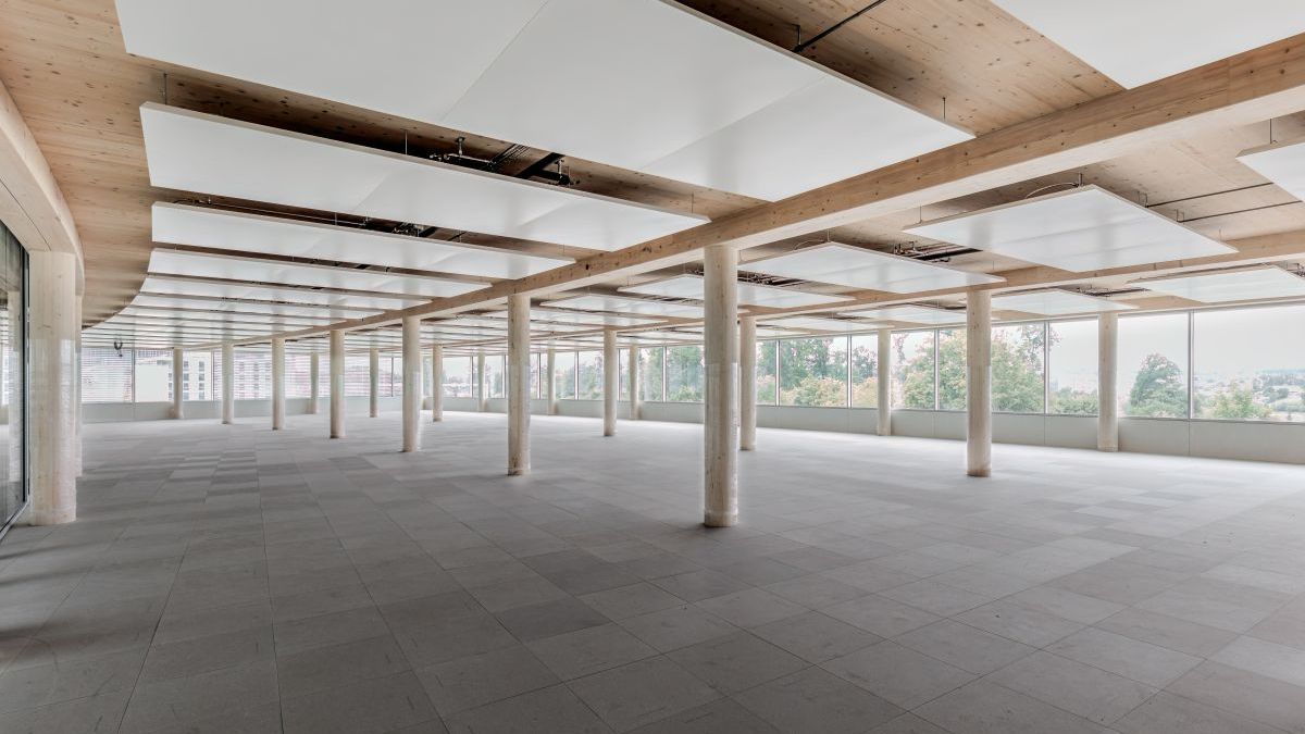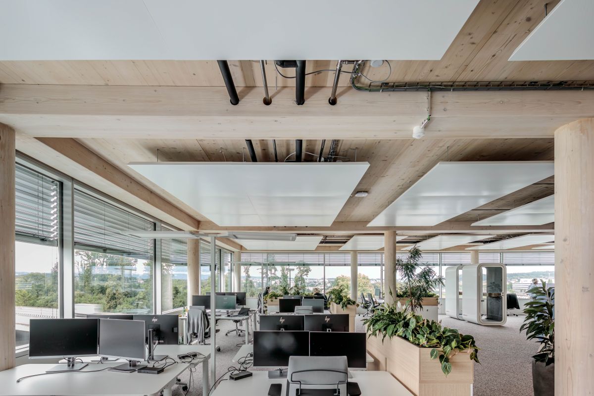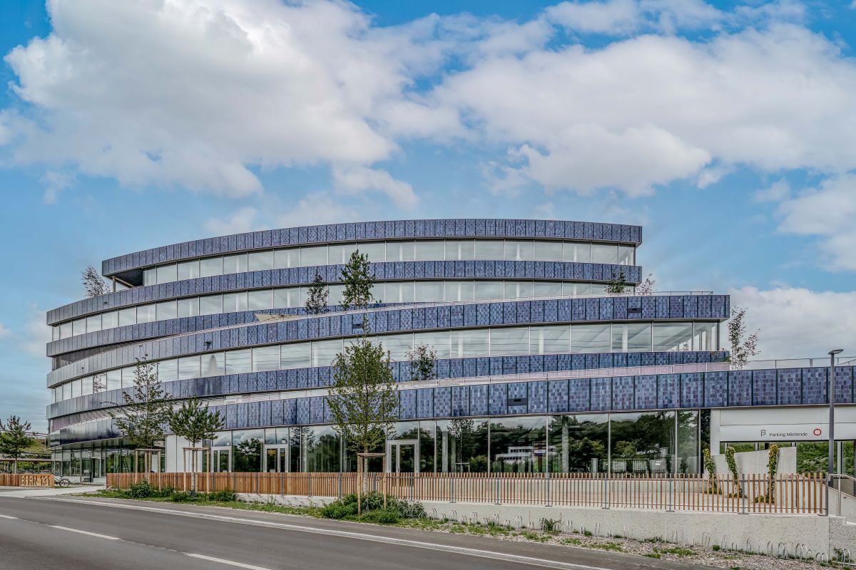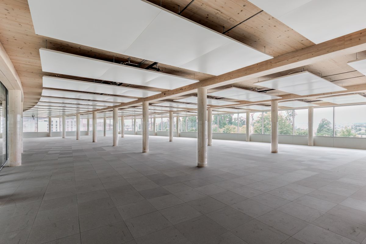 Das Dienstleistungsgebäude wurde im Hybrid-Holzbau nach SNBS Gold Standard realisiert. Die Tragstruktur besteht ausschliesslich aus Schweizer Holz und wird durch Photovoltaik-Module auf Dach und Fassade ergänzt. Zusammen mit dem innovativen Haustechnikkonzept, das Erdsonden nutzt, entstand so ein nachhaltiges Leuchtturmprojekt, das mit seiner klaren, geometrischen Formensprache in Gestalt eines regelmässigen Kreisbogen-Dreiecks auch städtebaulich ein starkes Zeichen setzt.