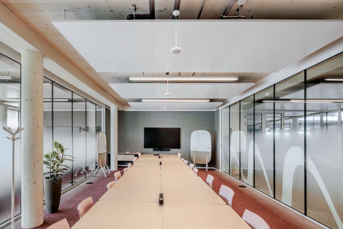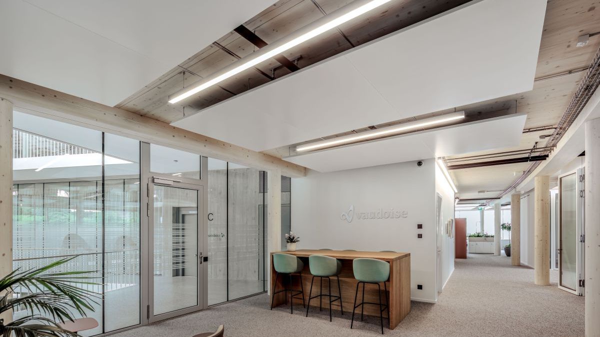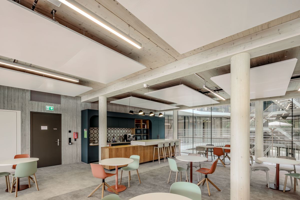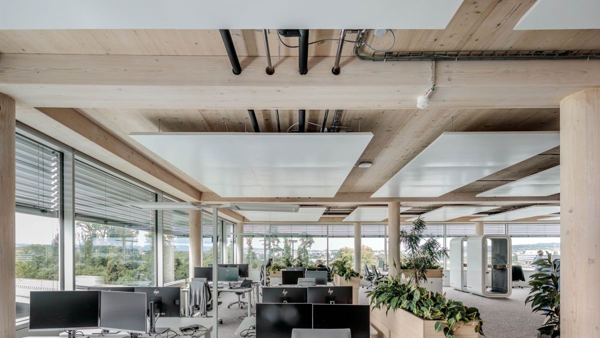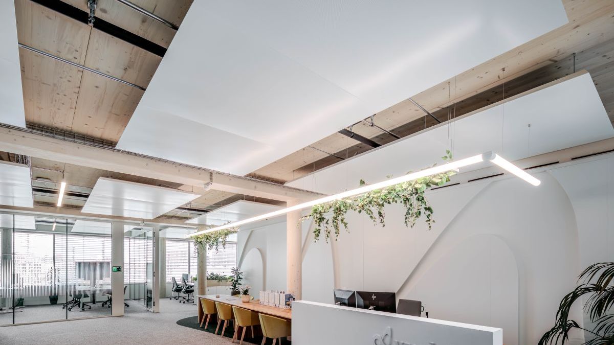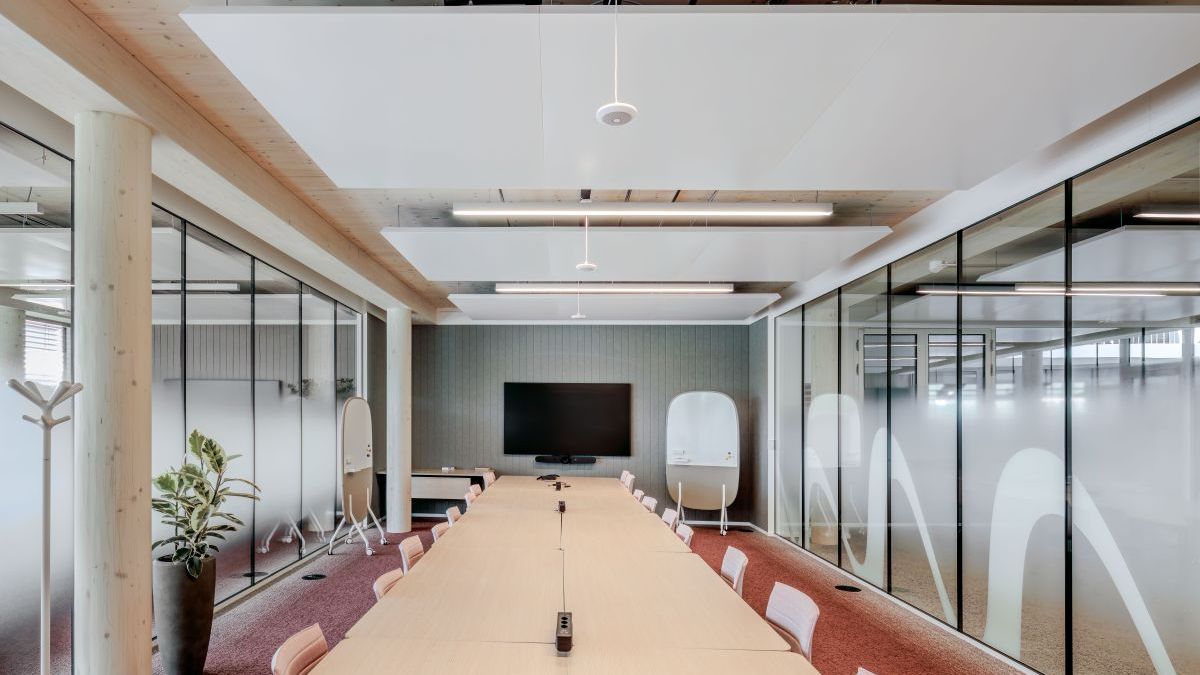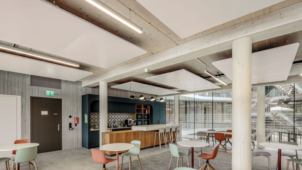 Für die Klimatisierung kam das leistungsstarke A11-S Heiz- und Kühlsegel zum Einsatz, das vollständig von der Raumluft umströmt wird. Die Register werden mit moderner Lasertechnik verschweisst und dauerhaft mit einem Spezialkleber an die Metallplatten gepresst, was einen optimalen Wärmeübergang ermöglicht und die Leistung zusätzlich steigert. Akustikvliese und optionale Dämmstreifen sorgen für eine hervorragende Raumakustik, ohne die Kühlleistung zu beeinträchtigen. Zusätzlich ist das A11-S mit einer EPD-Zertifizierung ausgezeichnet, die unabhängig geprüfte und transparente Informationen über die Umweltbelastungen während des gesamten Produktlebenszyklus liefert und so den nachhaltigen Anspruch des Projekts unterstreicht.