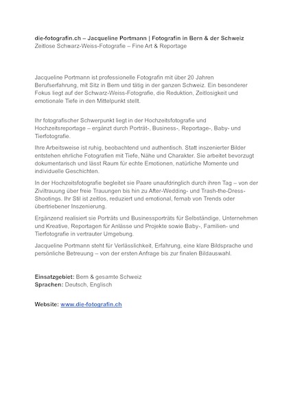 | Mitgliedschaften: | Freie Fotografin mit internationaler Erfahrung, Langjährie Erfahrung in der Hochzeits- und Fine Art Fotografie, Teilnahme an Ausstellungen in der Schweiz |