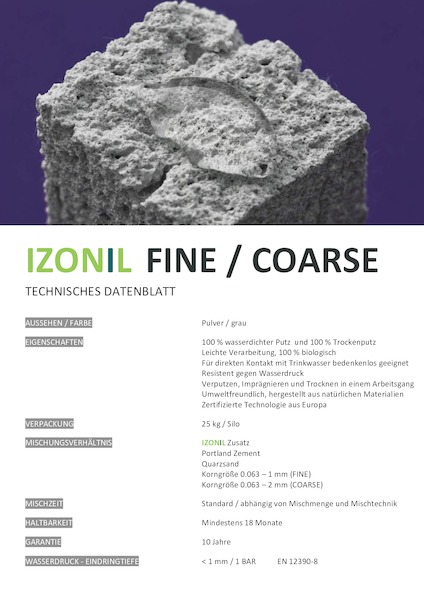 Izonil ist ein ökologischer Sanierputz, der Mauerwerk sowohl wasserdicht (bis 1 bar Druckwasser) als auch atmungsaktiv abdichtet. Er eignet sich besonders für gefährdete Bereiche wie Gebäudesockel, Keller und Garagen und bietet zugleich Schutz gegen Salz- und Säureeinträge sowie Schimmelbildung.