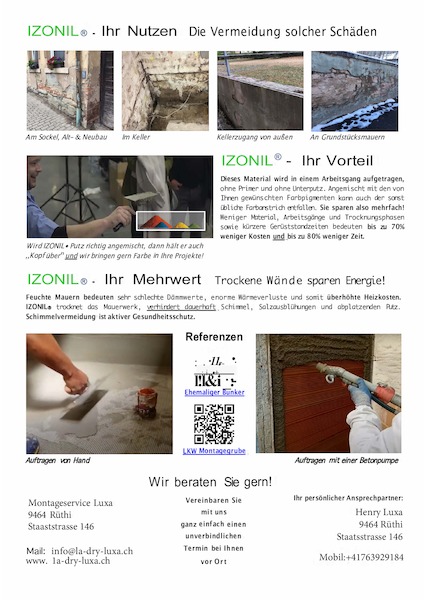 Ein Keller in Au SG konte nicht richtig genutzt werden da die Wände bis zu 90% Feucht wahren der muffige geruch und auch erste anzeichen von Hausschwamm wahren zu sehen. Nach der Abdichtung mit IZONIL gehört es der verganngenheit an. Jezt kann er wieder normal genutzt werden .