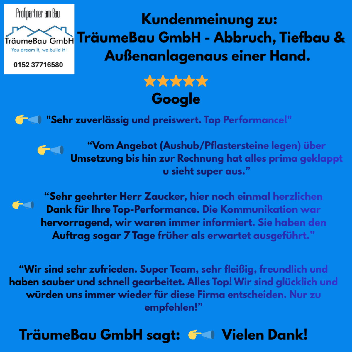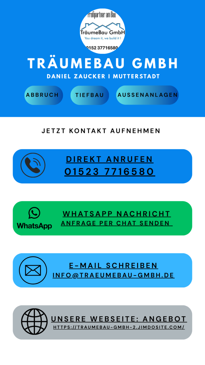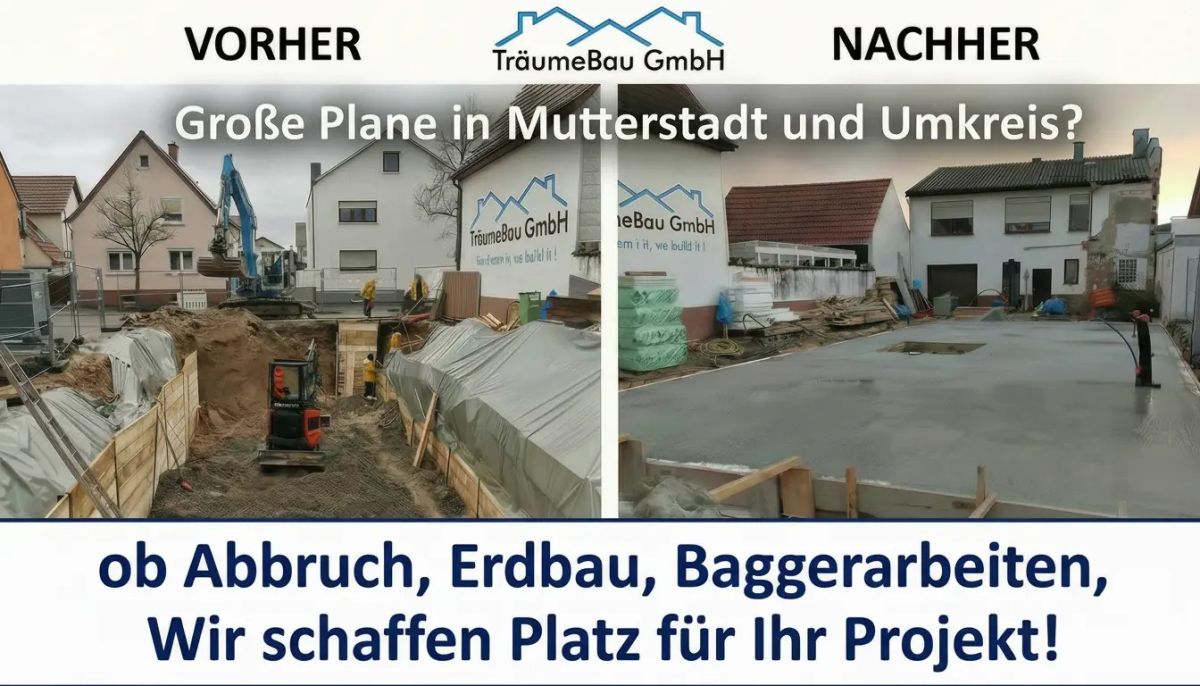 Was bietet die TräumeBau GmbH tatsächlich an? Die TräumeBau GmbH ist Ihr zuverlässiger Partner für Abbrucharbeiten, Tiefbau, Erdarbeiten, Pflasterbau und hochwertige Außenanlagen in Mutterstadt, Harthausen und der gesamten Region. Wir verbinden präzise Handwerksarbeit mit moderner Technik und sorgen für saubere, termingerechte Ergebnisse – vom kleinen Privatprojekt bis zur anspruchsvollen Baumaßnahme. Unsere Leistungen umfassen Abbruch & Entkernung, Baggerarbeiten, Fundament- und Erdarbeiten,
