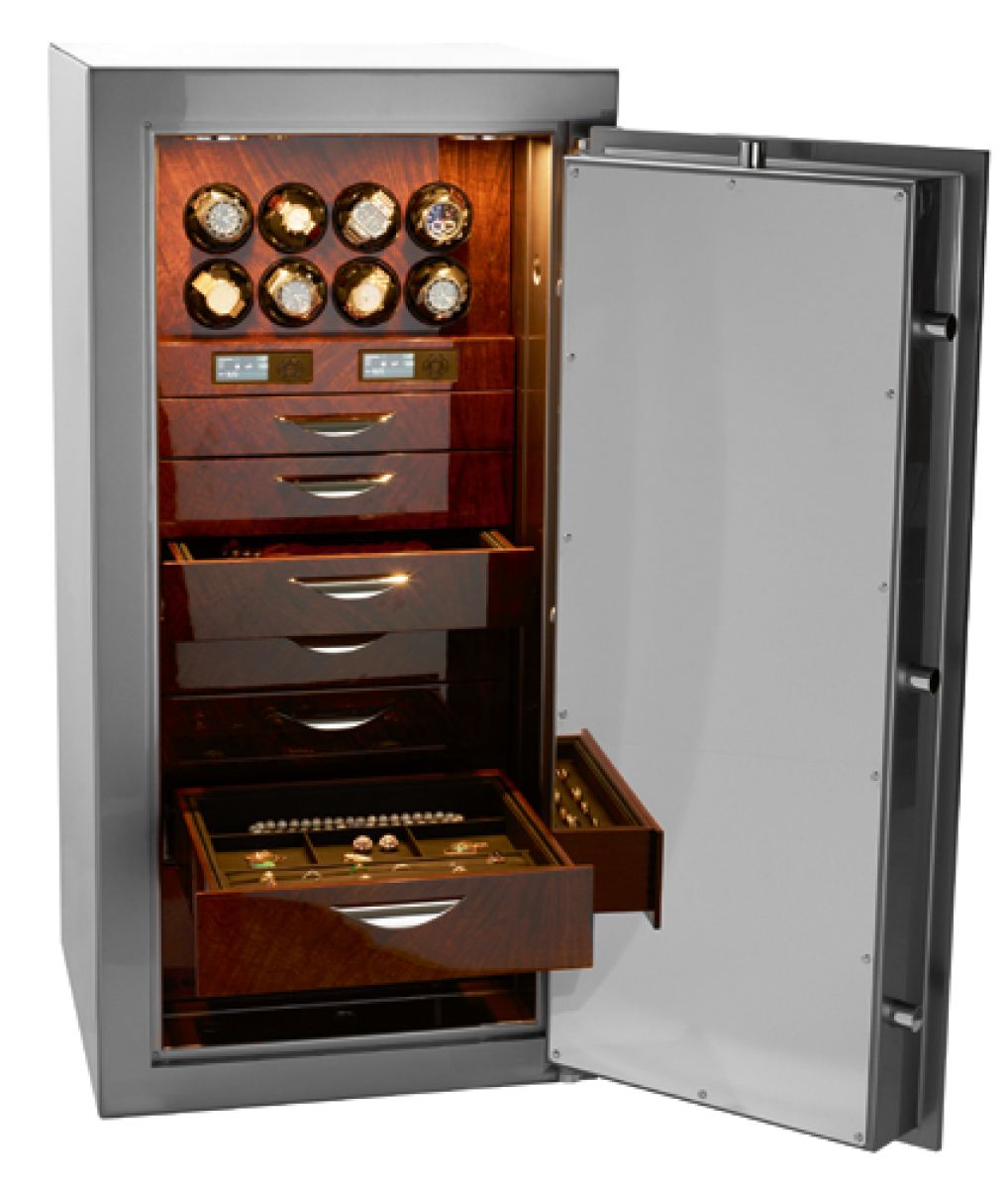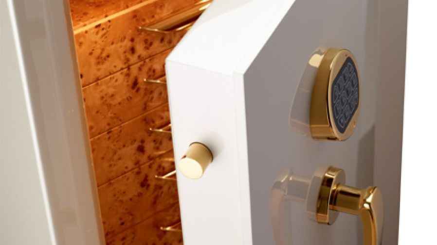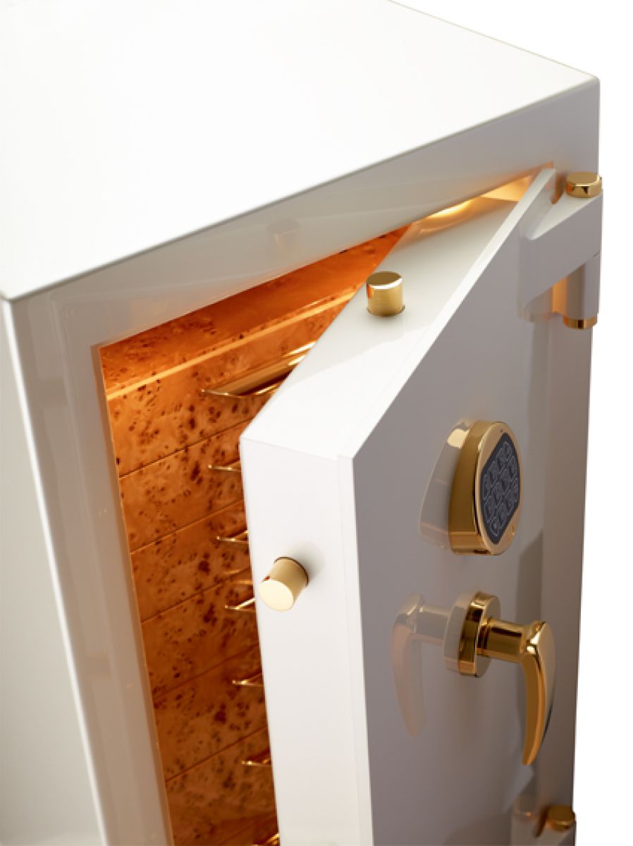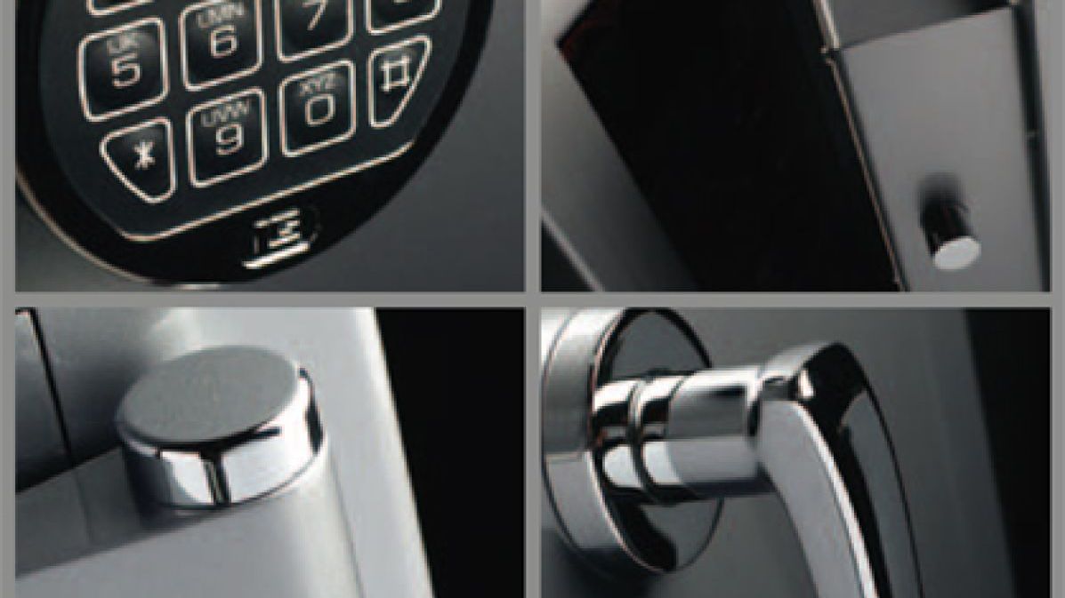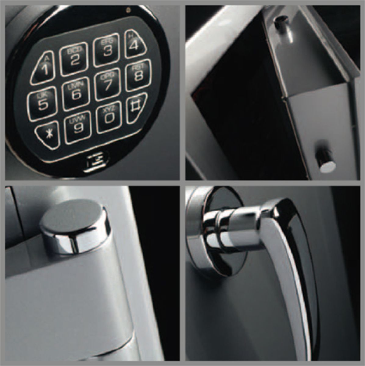 | Türverriegelung: | 3-seitige Bolzenverriegelung, Verschlussbolzen 25 mm, Hintergreifbolzen, Alukorund-Schlosspanzerplatte, Notverriegelung mit Schneidbrennsicherung, außenliegende Türscharniere (180° Öffnung), Invicta-Türgriff 45 mm vorstehend |